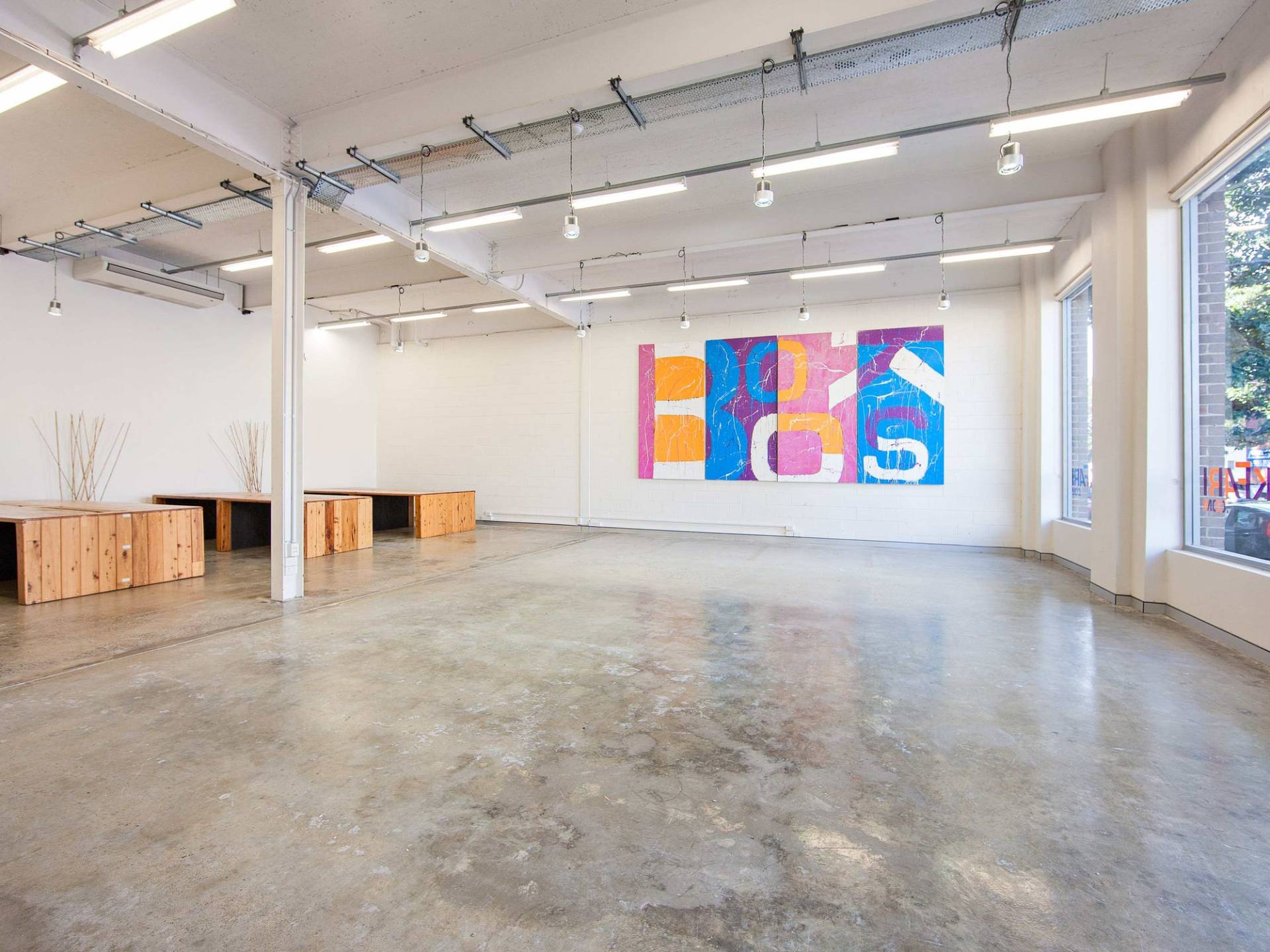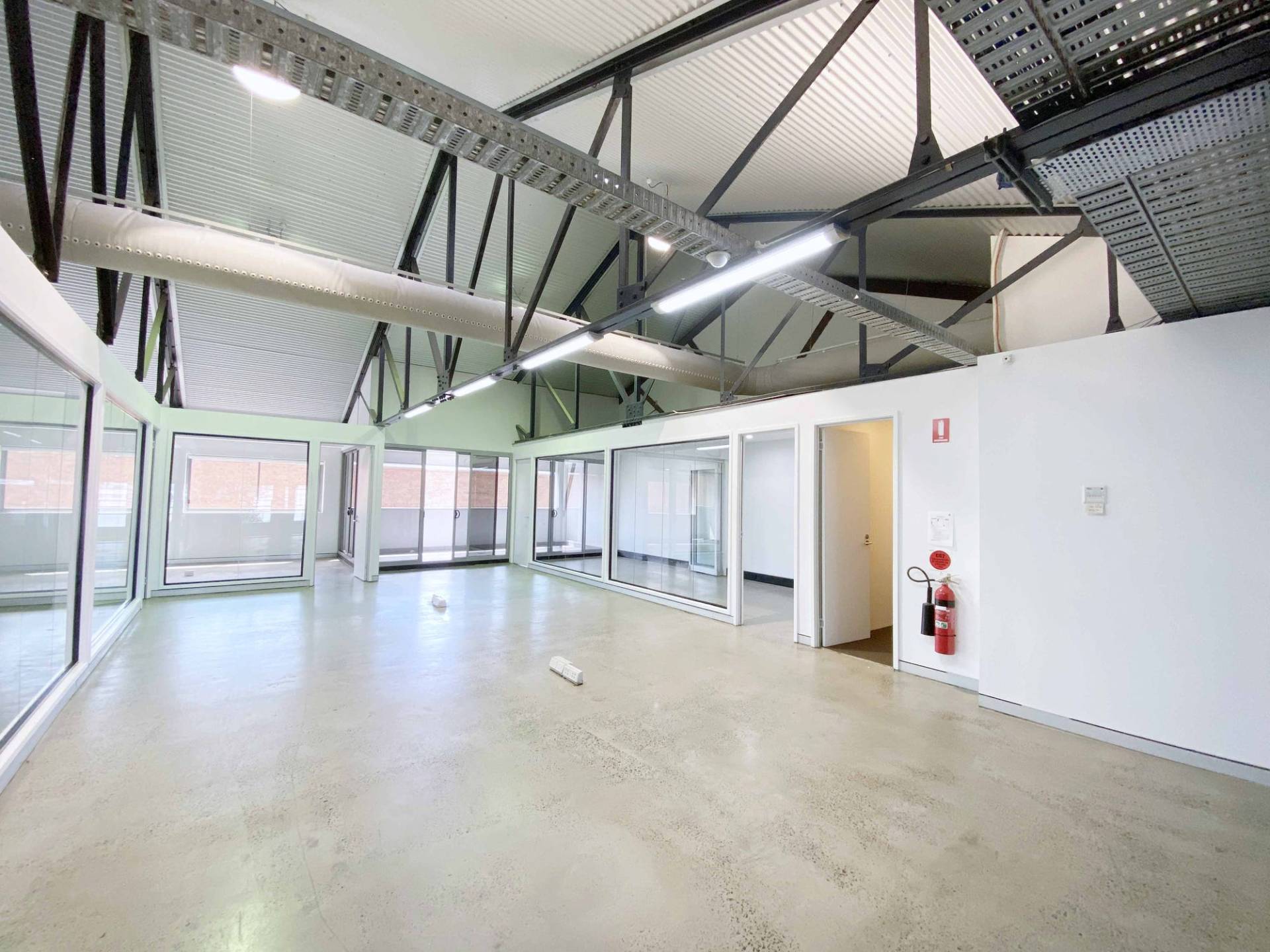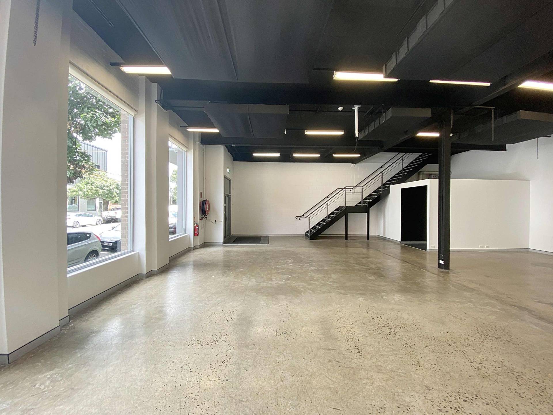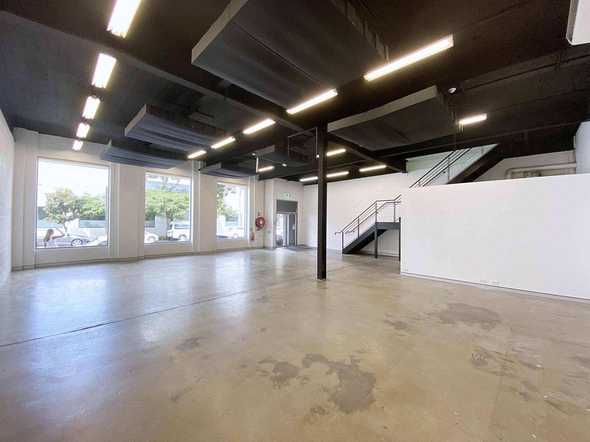 2 level space with concrete floors throughout